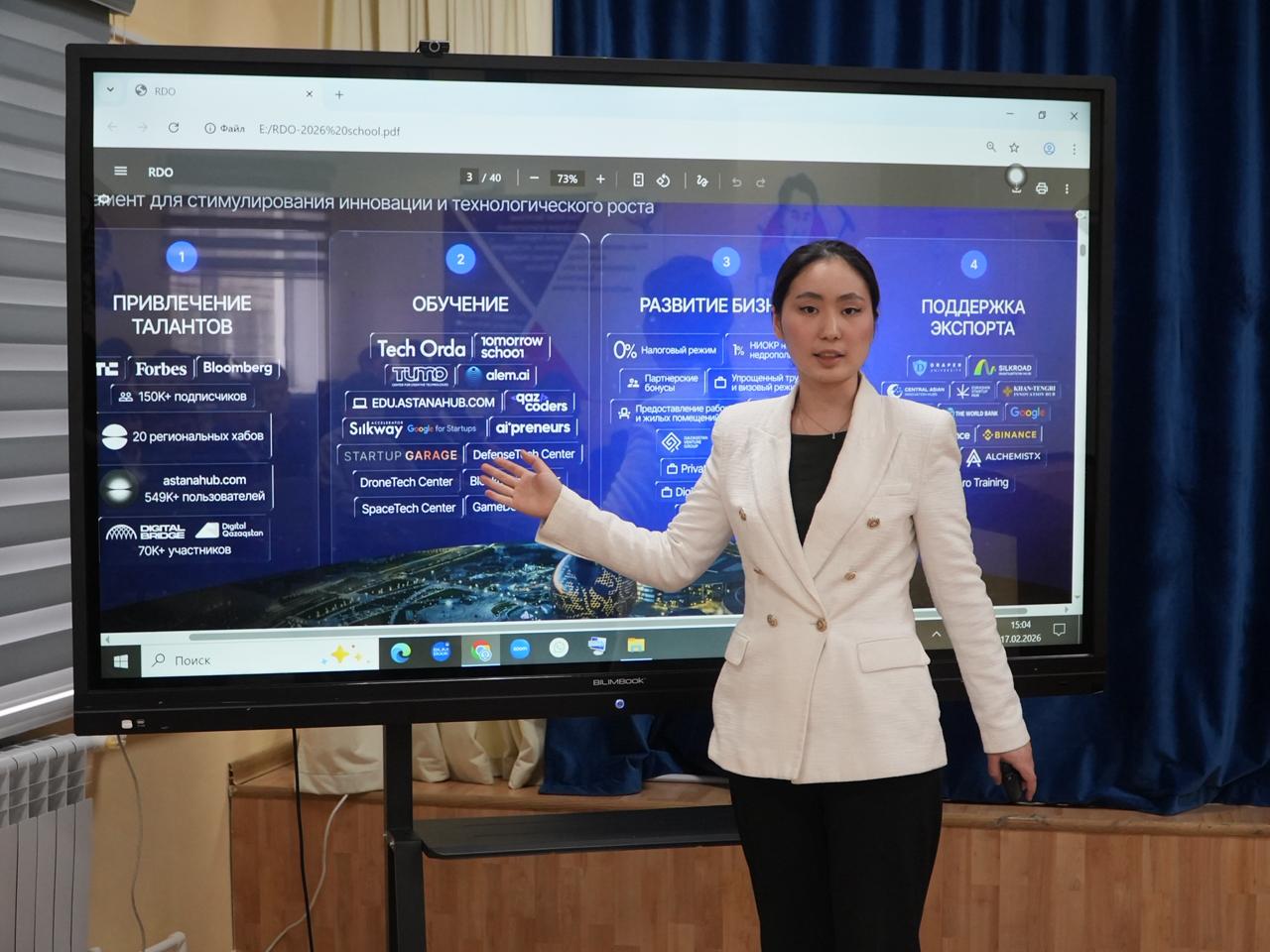 9–10 сынып оқушылары үшін Батыс Қазақстандағы цифрлық дағдыларды дамытуға, стартаптарды қолдауға және IT-қоғамдастық құруға бағытталған Batys Hub орталығының қызметкерлерімен кездесу өтті. Кездесу барысында оқушыларға өңірімізде өтетін хакатондар, стартап-жобаларға қатысу мүмкіндіктері туралы ақпарат беріліп, IT саласында өз идеяларын жүзеге асыруға бағыт-бағдар ұсынылды. Мамандар оқушыларды белсенділік танытып, жобалармен айналысуға шақырып, қолдау көрсетуге дайын екендерін жеткізді.